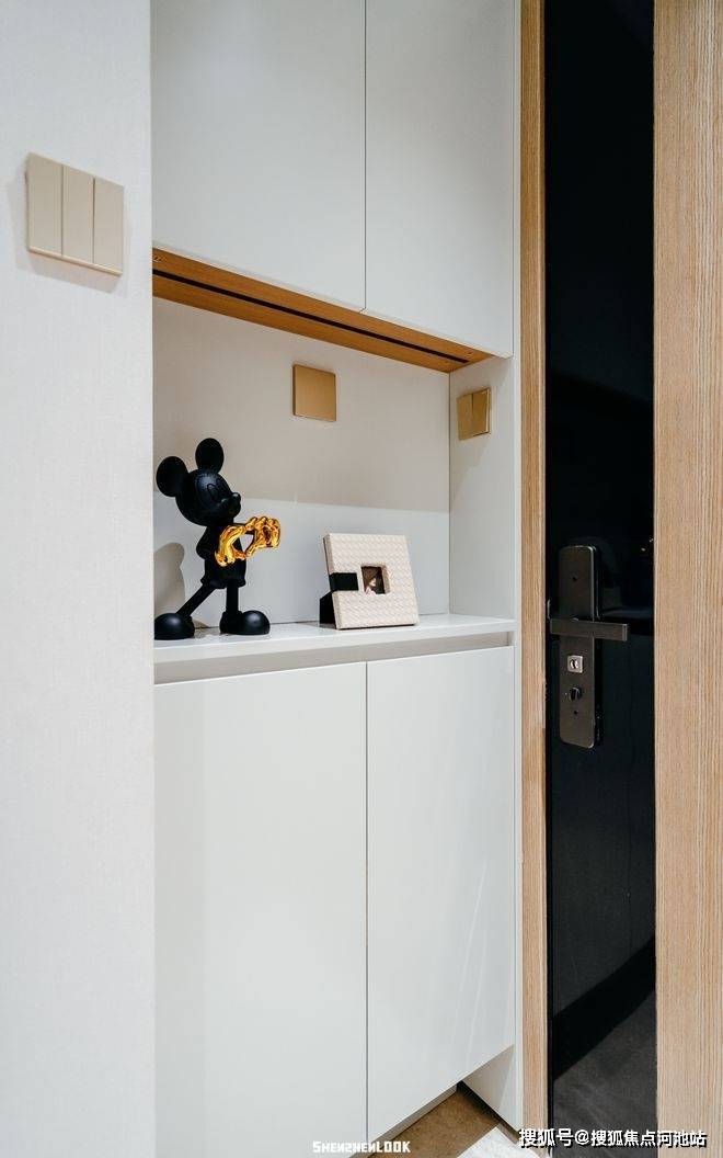 从玄关进门,一侧是隐藏式鞋帽柜,入门即收纳。一字型开放厨房,把过道纳入餐厨区,避免了逼仄感,油烟机、燃气灶一应俱全。另一侧为干湿分离的卫浴,合理地规划了每一寸空间。