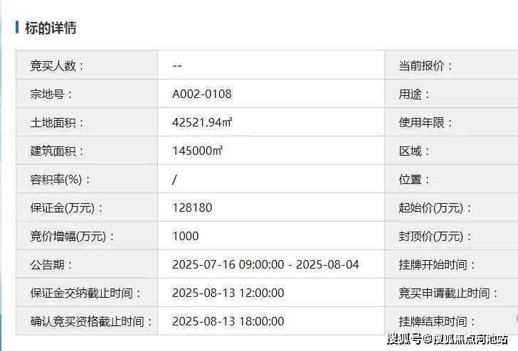 土地面积42521.94㎡,建筑面积145000㎡,挂牌起始价64.09亿,8月15日出让。