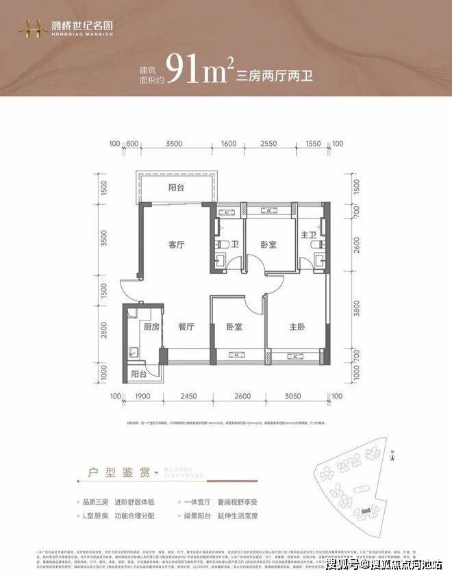 91㎡的3房2厅2卫,设计的是竖厅南北通透格局,客厅3.5米开间,LDKB一体化设计,3个卧室分别做到了3.05米/2.6米/2.55米的宽度,L型厨房带1个小生活阳台,卫生间干湿分离,阳台主朝正北向。