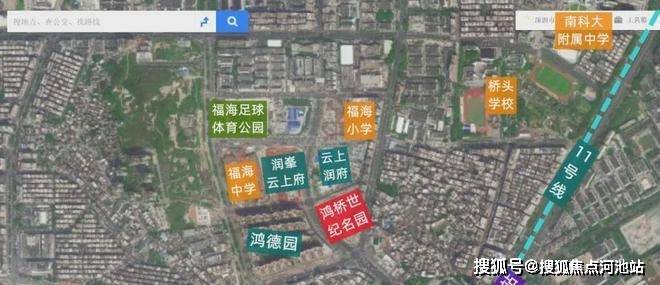 鸿桥世纪名园,位于宝安区福海街道桥头社区富桥大道与桥塘路交汇处,项目东侧是大片城中村,西侧是一期鸿德园,北侧是云上润府,西北侧是2022年入市的润峯云上府,11号地铁线“桥头站”距离约600米。