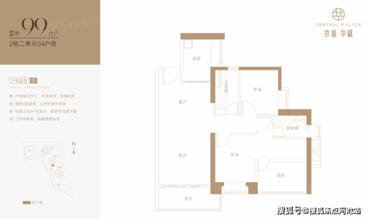 99㎡的3房2厅2卫,仅2栋2单元04户型才有,设计的是竖厅格局,LDKB一体化,动静分区,三开间朝南,L型厨房,卫生间干湿分离,得房率约73%(不含赠送),阳台西南朝向。