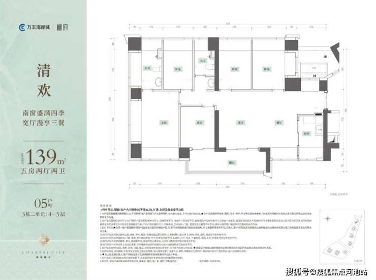 139㎡的5房2厅2卫,设计的是横厅南北通透格局,客餐厅6.25米开间,LDKB一体化,全屋12面飘窗,分别做到了主卧19.76㎡/次卧10.66m²/次卧10.47㎡/次卧9.98㎡/次卧9.28㎡(包含墙体飘窗),U型厨房,公卫三段式干湿分离,得房率约76.4%(不含赠送),客厅连接次卧出6.8米长的观景大阳台约11.9m²东南朝向。套内面积106.21m²+赠送面积约29.47m²=实用面积135.68m²,加上赠送后得房率约97.6%。