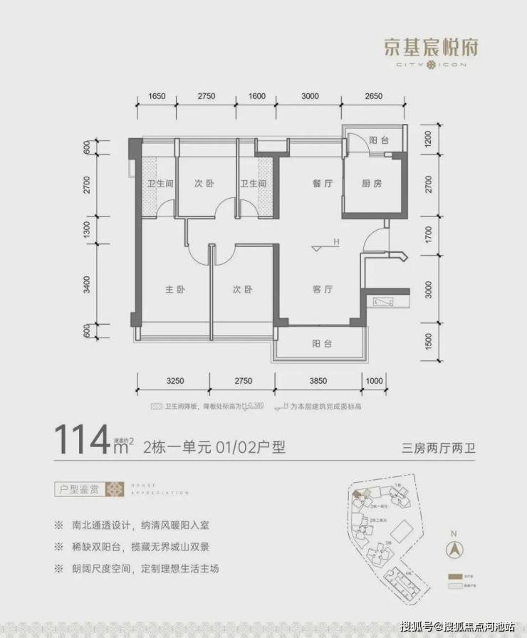 其中,建面约110-114㎡3房2厅2卫: