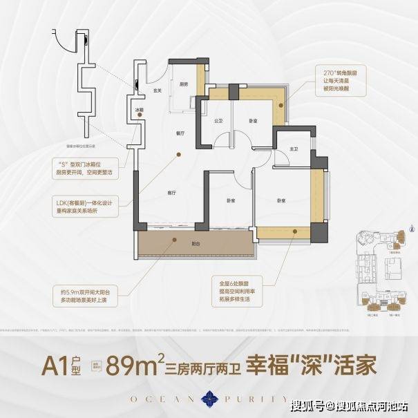 89平3房2厅2卫,竖厅格局,客厅预留冰箱卡槽位,客厅与次卧通阳台,三开间朝南,主卧套房设计展现私密性,次卧270度飘窗,整个户型有 5 个飘和6米大阳台,使用率在 95% 左右。