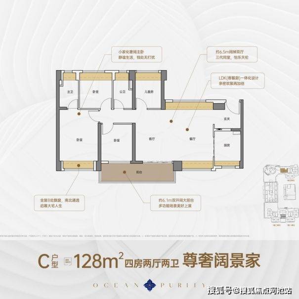 128平4房2厅2卫,南北通透横厅格局,进门口转角玄关柜,客厅面宽6.5米,餐厅南北飘窗呼应,客厅连通卧室6.1米大阳台,卧室南北对流,整个户型有8个飘窗且面积大,使用率超100%。
