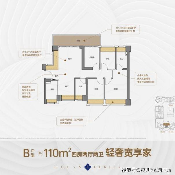 110平4房2厅2卫,南北通格局,进门L凸窗做柜子,客厅开间4.2米,餐厅带大飘窗,客厅联通儿童房6.5米大阳台,5开间朝南,主卧套房南北通透,整个户型有9个飘窗,使用率在98%左右。