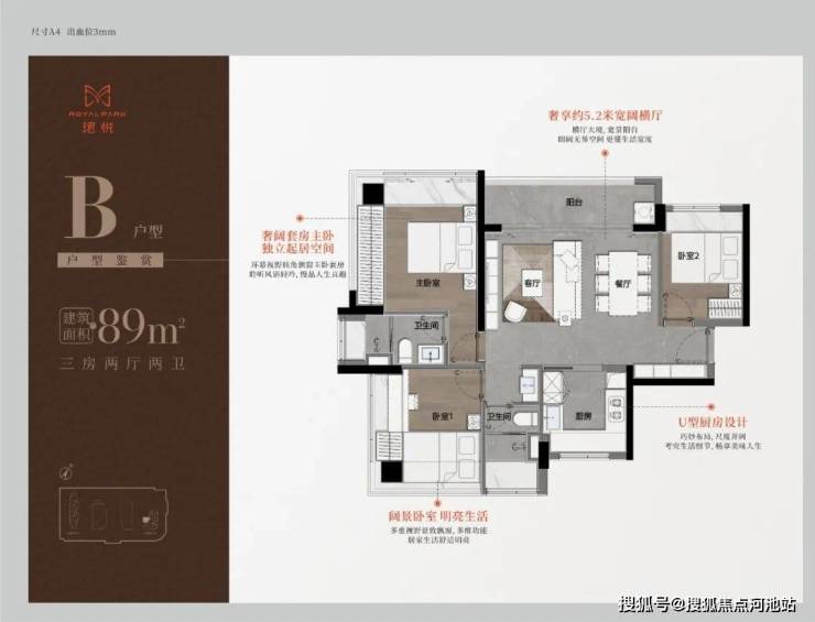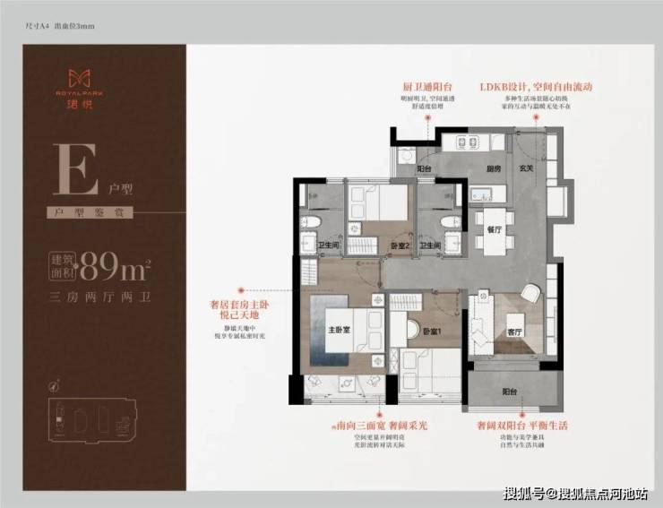 89㎡三房二卫A/B户型,位于1栋一单元,两开间阳台,主卧都有双面凸窗赠送。