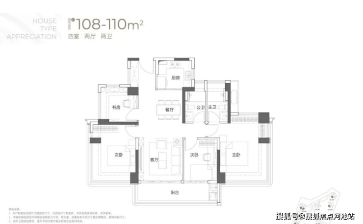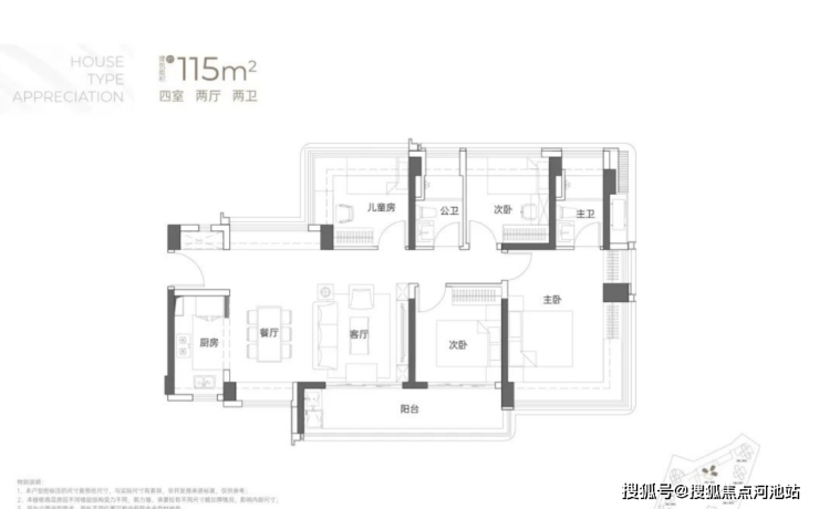 115㎡4房2卫,均为横厅设计且阳台宽敞,有东南、西南、西北三种朝向,户型格局差异小,核心区别在于阳台设计依朝向和景观调整。