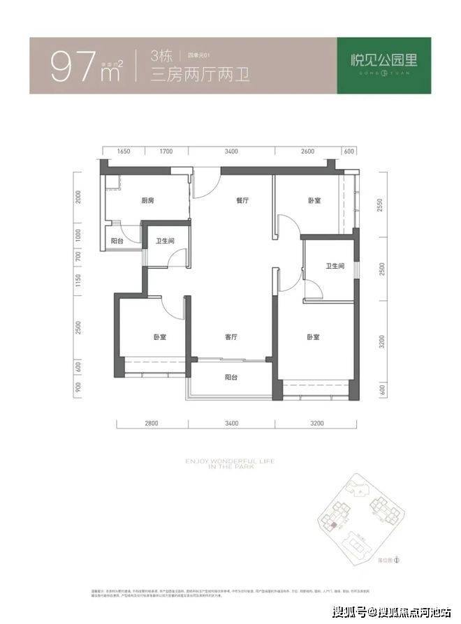 97㎡的3房2厅2卫,仅3栋4单元01户型,设计的是竖厅双龙抱珠格局,客厅3.4米开间,三开间朝南,3个卧室分别做到了主卧11.97㎡/次卧7.47㎡/次卧7.17㎡(实测面积,去掉墙体),L型厨房带1个生活阳台,公卫三段式分离,得房率73.61%(不含赠送),东南朝向。