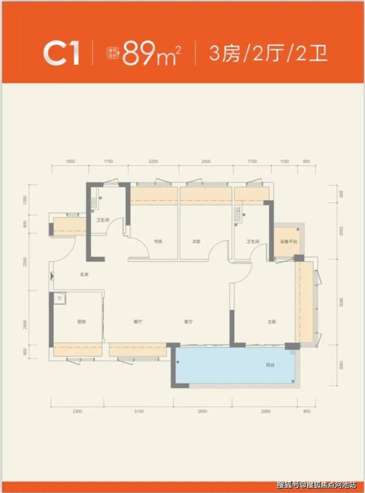 89㎡的3房2厅2卫,横厅南北通透格局,进门入户玄关,客餐厅5.7米开间,LDKB一体化,四开间朝南,主卧还带1个设备平台,主卧连接客厅出5.5米长的超大阳台,U型厨房,卫生间三段式分离,赠送面积高达20.09㎡,实际得房率约101%(包含赠送),西南/东南朝向。