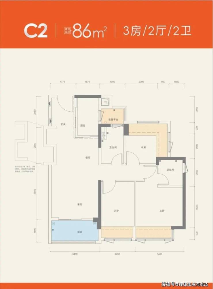 86㎡的3房2厅2卫,经典竖厅格局,客厅3.45米开间,LDKB一体化,S墙设计预留冰箱卡槽位,三开间朝南,U型厨房,卫生间干湿分离,还带1个设备平台,赠送面积高达12.93㎡,实际得房率约98%(包含赠送),西南/东南朝向。