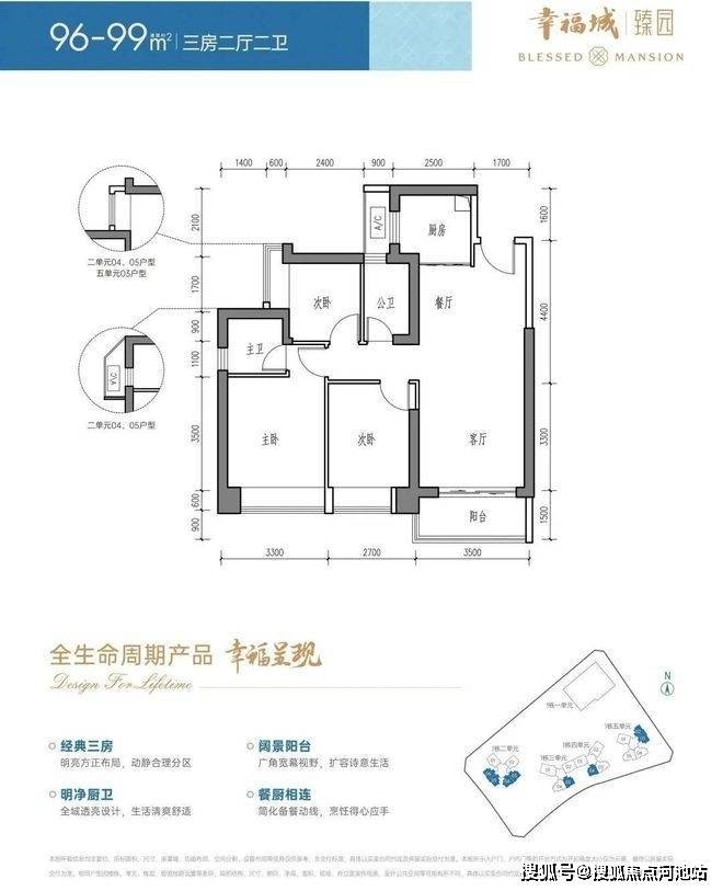 面积:96-99㎡三房两厅一卫