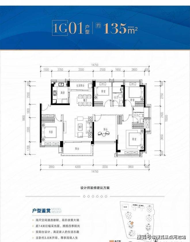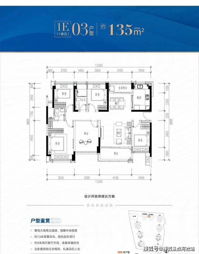 135平5房2卫,南北通透双阳台,东南朝向看花园,赠送面积21.51-21.8㎡,加赠送得房率约95.56-95.78%。