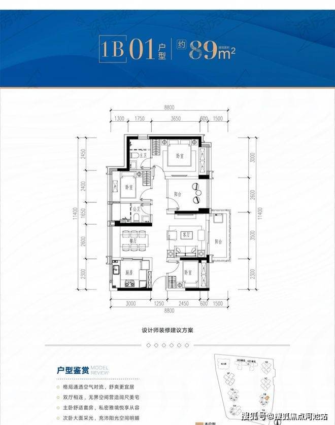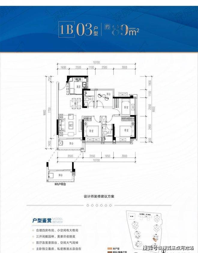 89平4房2卫,竖厅格局,赠送面积约11.85-15.02㎡,加赠送后得房率约93-96.48%。