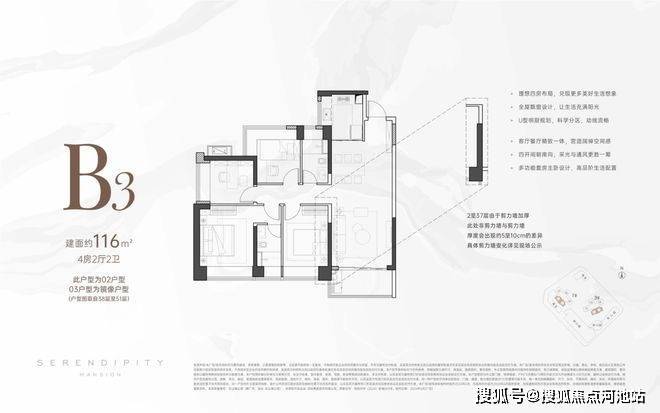 116㎡:4房2厅2卫,传统的竖厅动静分区户型,分布在1/3栋的02/03户型,东南和西南两种朝向;唯一的不足就是厨房的空间有点小,其他各个空间比较均衡,客厅的开间3.7米,一眼望去很大气,卧室的飘窗比较好利用,特别是比较小的次卧是 L 型的飘窗,采光、视野更好些;主卧较大,不过没有独立的衣帽间。