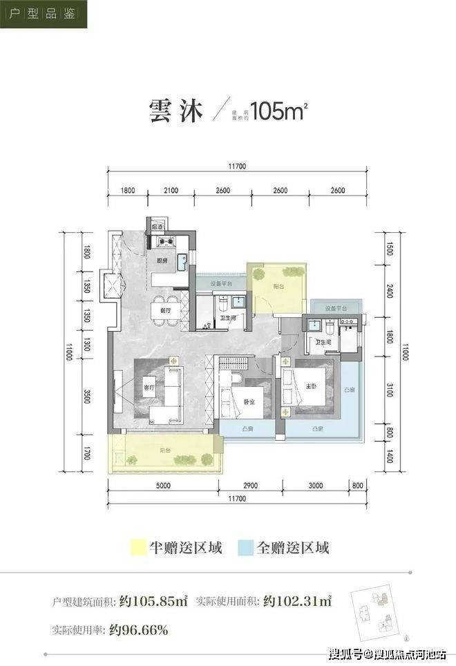 105㎡的3房2厅2卫,设计的是经典竖厅格局,进门入户玄关,超大宽面客厅5米开间,S墙设计预留冰箱卡槽位,三开间朝南,3个卧室分别做到了主卧16.62㎡/次卧11.31㎡/次卧7.28㎡(实测面积),还带2个设备平台,得房率约96.1-96.69%(包含赠送),东南或东北朝向。
