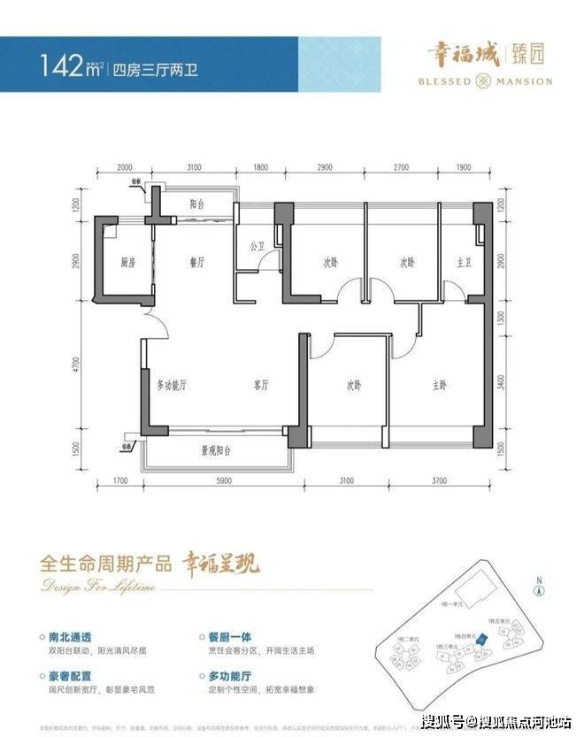 142㎡的4房3厅2卫,设计的是横厅南北通透格局,进门入户玄关,客厅5.9米开间,餐厨一体化设计,南北双阳台,全屋6个飘窗面,4个卧室分别做到了主卧18.31㎡/次卧12.4㎡/次卧10.15㎡/次卧9.45㎡(包含墙体飘窗),客厅出5.9米长的观景大阳台,U型厨房,公卫三段式分离,得房率约87.1%(包含赠送),阳台主朝东南向。
