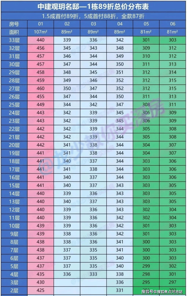 89折后均价3.87万/㎡,价格区间如下: