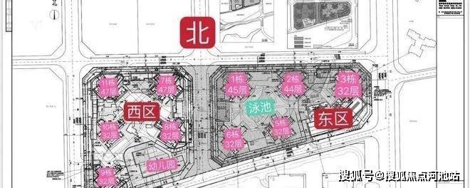 东区:占地约2.1万㎡,容积率5.28,包含住宅、商业、文化活动室、老年人日间照料中心和其他基础配套设施。1栋、2栋总高47F,3T6户;3栋、5栋总高32F,2T6户;6栋总高32F,2T5户;4栋属于商业,总高2层。