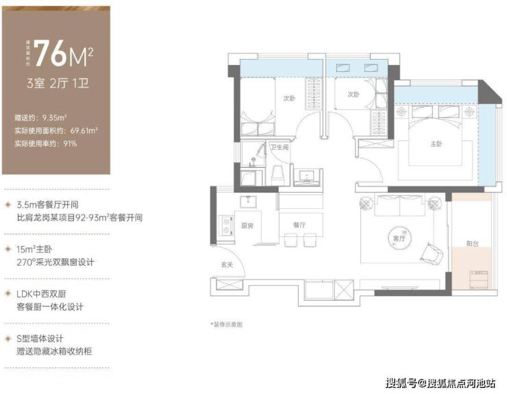 高质产品:建面约76-130㎡精质美宅,实际使用率达91-99%,更大居住空间,更高舒适度;