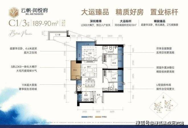 89㎡3房2厅2卫:设计的是经典横厅格局,LDKB一体化,进门入户玄关,客厅带3.5米阳台,U型厨房,主卧南北通透270度景观,卫生间干湿分离。