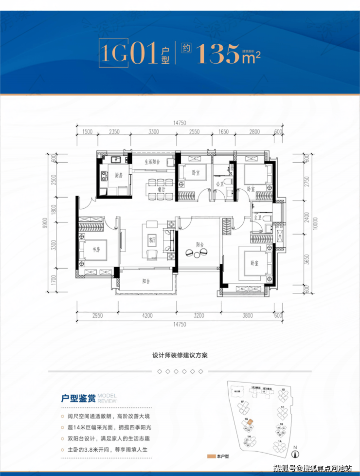 本次推售1栋共874套房源,户型包括81㎡3+1房、89-109㎡4房2卫和135m²5房2卫。