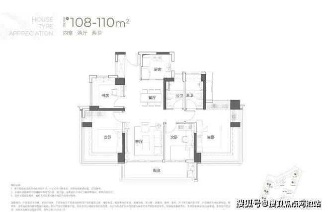 竖庭格局,西南向,基本居住功能与建面约108-110㎡4房2卫一致,但格局不一样,从目前公布的户型图上看,主要是主卧空间有了更大的提升,比如可以放更大一点的衣柜。