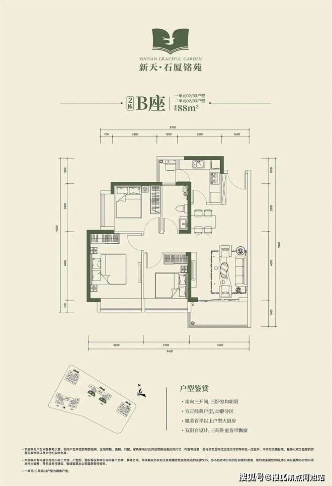 2栋B座一单元02、03户型、2栋B座二单元02、03户型:面积约为88㎡的3房2厅1卫;