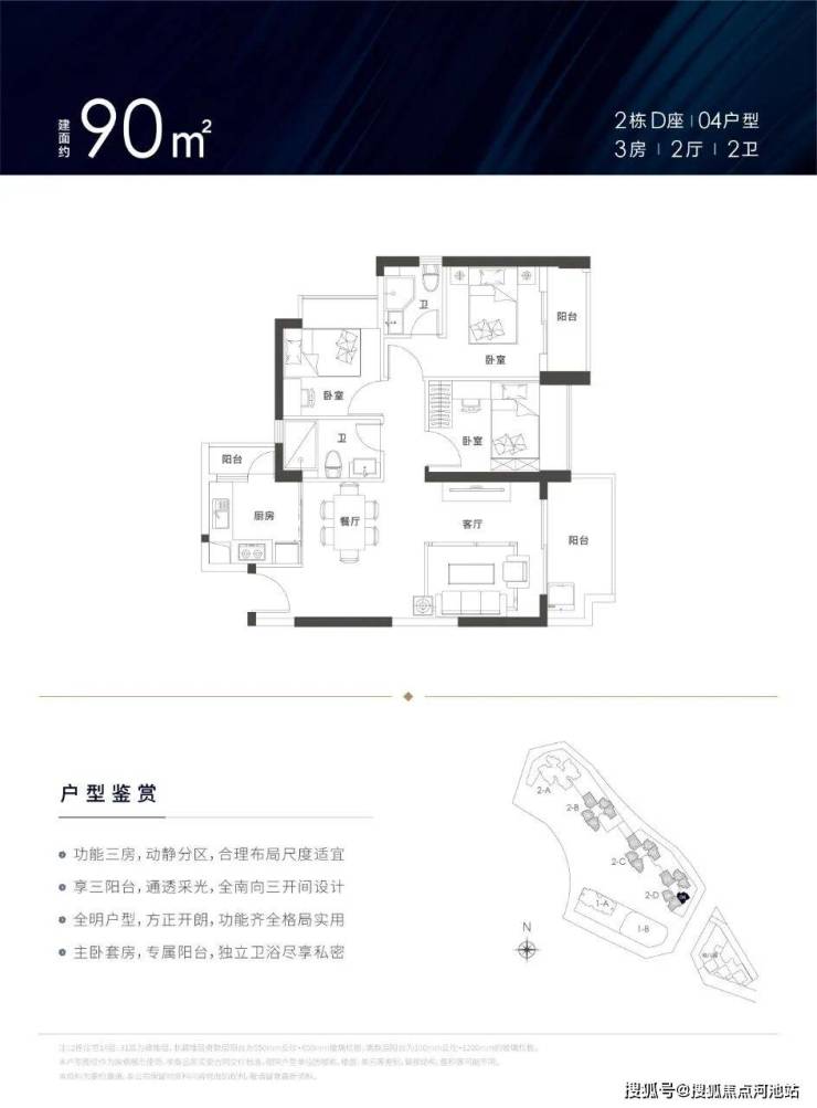住宅建面约79-129㎡3-4房户型,南北通透,3房3.5~3.7m,4房3.8~4.2m,罕见阔绰开间,客厅、厨房、卧室三阳台多飘窗,超高使用率。