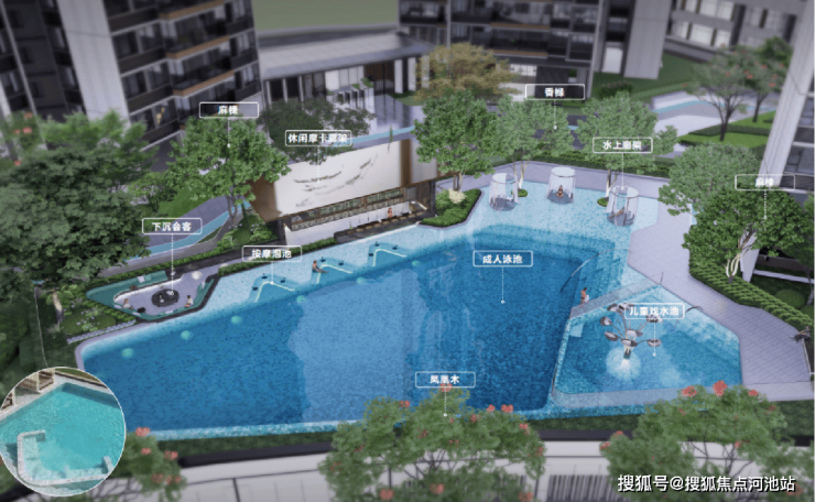 社区内还打造了无边界的望山泳池,位于整个园林的中轴位置。