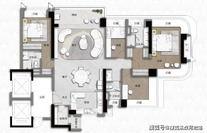 173㎡大四房三卫:项目顶配户型,专梯入户,私密性强;双套房设计,主卧约 27㎡,带 270° 环幕凸窗、私享阳台、衣帽间与明卫;北向可俯瞰市民中心灯光秀与 CBD 天际线,定位高端改善。
