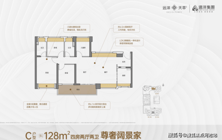 128㎡的4房2厅2卫:是横厅、南北通透的设计。客餐厅连一块儿,开间有6.5米,一进门有入户玄关,客厅、餐厅、厨房、阳台打通成一体(LDKB一体化) 。客厅连着次卧,有个6.1米长的大阳台。主卧是大套间样式,家里一共有8处飘窗。厨房是U型的,卫生间干区湿区分开。不算赠送的话,得房率大概72.16% ,套内面积是92.45㎡,阳台主要是朝南的方向 。