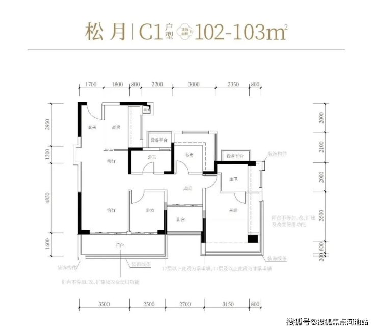 102-103㎡的4房2厅2卫,C1-C2户型,设计的是经典竖厅格局,进门入户玄关,客厅3.5米开间,LDKB一体化,S墙设计预留冰箱卡槽位,动静分区,四开间朝南,4个卧室分别做到了主卧17.98㎡/次卧8.37㎡/次卧8.1m²/次卧7.75㎡(包含墙体飘窗),L型厨房,公卫干湿分离带1个约2m²的设备平台,得房率约81%(不含赠送),客厅连接次卧出9.6m²的观景大阳台,东南或西南朝向。套内面积83.43m²+赠送面积23.86m²=实际使用面积107.29m²,加上赠送后得房率约104.16%。