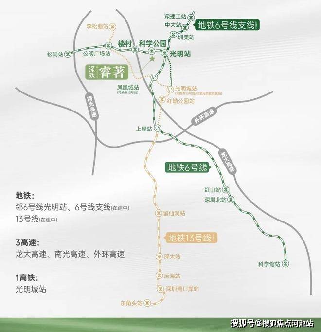 项目周边有6号地铁线3站点环绕,包括光明站(距离约1公里)、科学公园站(直线距离800米)和楼村站(距离约1.2公里)。其中,光明站可换乘6号支线,快速通达其他区域。