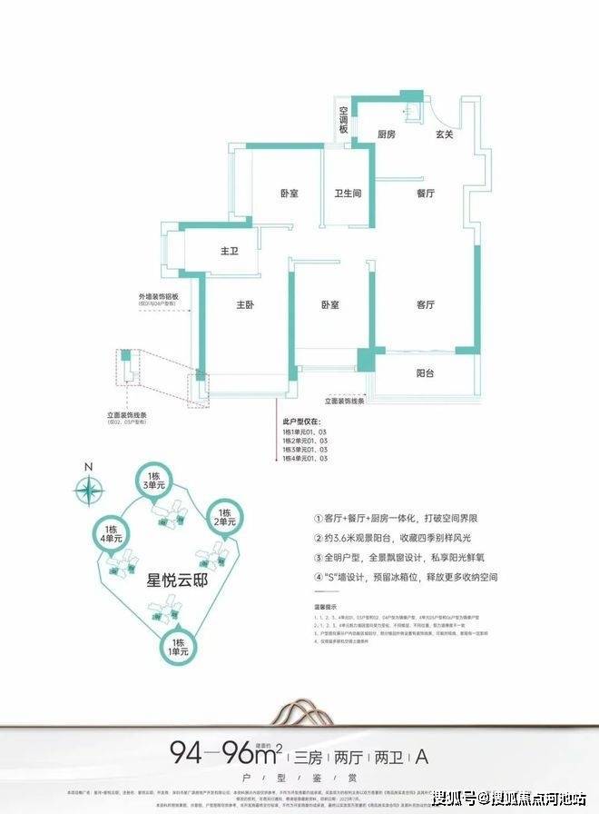 94㎡的3房2厅2卫,设计的经典竖厅格局,客厅3.6米开间,客餐厨一体化,S墙设计预留冰箱位,三开间朝南,U型厨房,得房率:78.15%(不含赠送),有西南及东南朝向。
