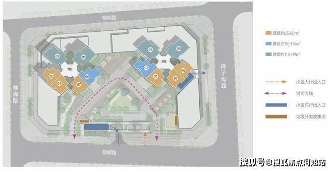 共由5栋32-48层高的住宅组成,其中1栋1/2单元住宅48F,2栋1单元住宅32F,2栋2单元住宅47F,3栋住宅48F,4栋是1所幼儿园,还配建有社区菜市场。