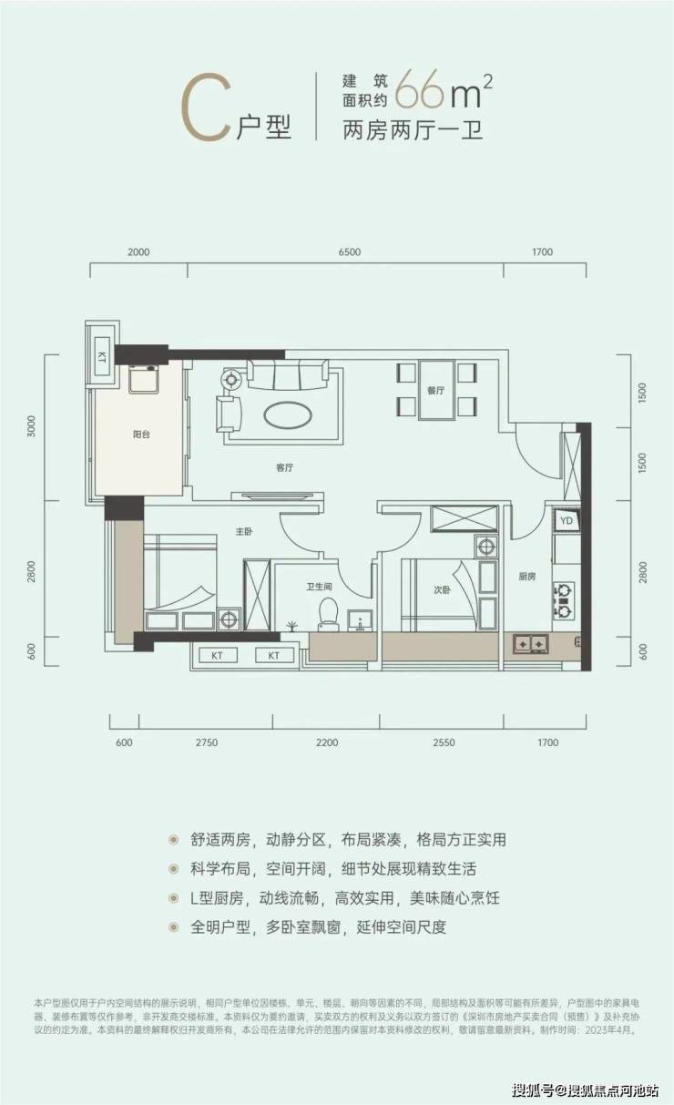 66㎡的2房1卫,设计的竖厅格局,客厅3米开间,有东西2个朝向;