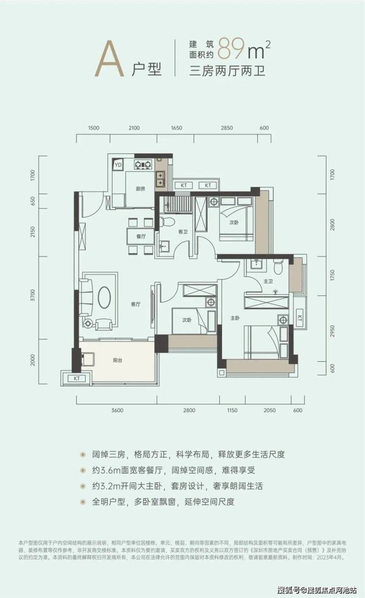 89㎡的3房2卫,设计的传统竖厅格局,客厅3.6米开间,有东、西、南3个朝向;