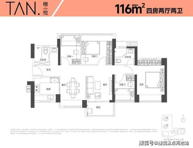 116㎡四房两厅两卫户型采用横厅南北通透设计,6 米开间的客餐厅与五开间朝南的布局,形成约 13.8 米的采光面。南北双阳台设计不仅实现了穿堂风效果,更通过赠送约 12㎡的非产权面积(含阳台、飘窗),使得房率含赠送达 82%,成为片区内改善型产品的标杆。这种 “大面宽、短进深” 的设计,在保证空间尺度的同时,也为家庭互动提供了更多可能。