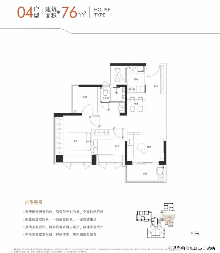 76㎡的3房2厅1卫,设计的是竖厅格局,LDKB一体化,动静分区,三开间朝南,二字型厨房,卫生间三段式干湿分离,得房率约94%(包含赠送),东南朝向。