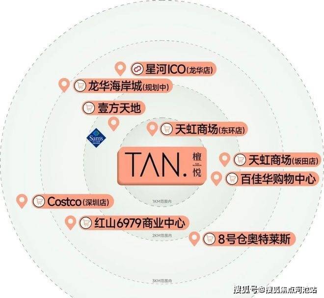 项目自带特色商业街,并且紧邻项目有天虹商场(东环店),距离壹方天地(建面约60万㎡航母级体验式商业集群)约1.5km,周边还有山姆会员店、天虹商场(坂田店)以及Costco会员旗舰店等,一站式满足不同生活需求。