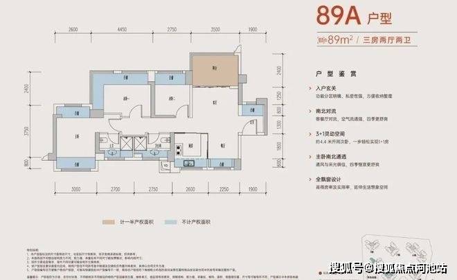 89㎡的3房2厅2卫,C3户型,设计的是竖厅格局,进门入户玄关,客厅3.5米开间,LDKB一体化,动静分区,三开间朝南,S墙设计预留冰箱卡槽位,主卧南北通透设计,分别做到了主卧14.5㎡/次卧8.37㎡/次卧7.44㎡(包含墙体飘窗),U型厨房,卫生间干湿分离,得房率约:77.3-77.39%(不含赠送),东南朝向。赠送面积18.88㎡,加上赠送得房率98.29%。