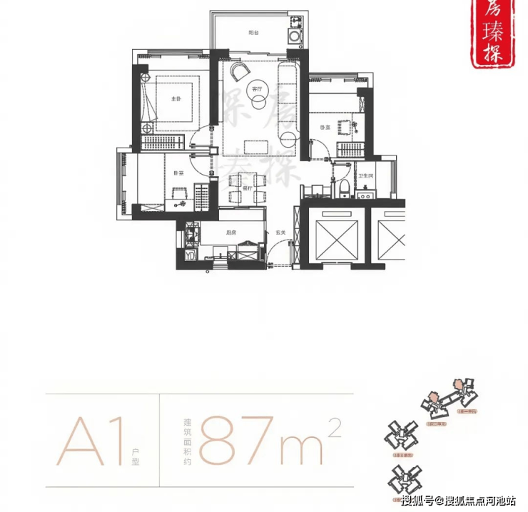 87㎡的3房2厅1卫,A1户型,1栋1/2单元01户型,设计的是竖厅双龙抱珠格局,进门入户玄关,LDKB一体化设计,L型厨房,卫生间三段式分离,得房率约72%(不含赠送),西北或东北朝向。