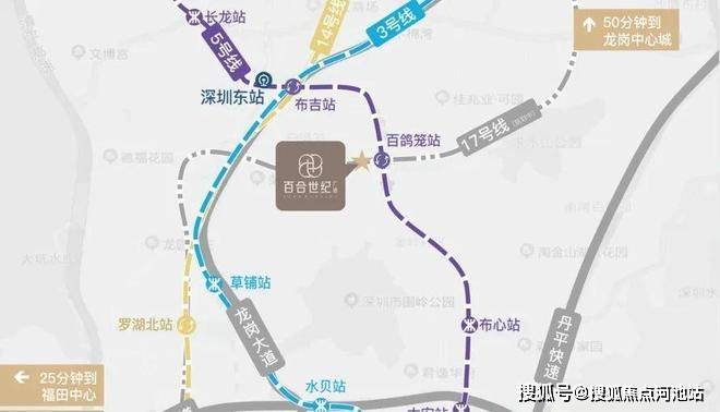项目位于 5/17 号(规划中)百鸽笼站双地铁线上盖,1 站换乘 3/14 号线,4 站抵达福田芯,高效串联南山 / 前海,1 站直达深圳东站,7 站快速通达深圳北站。