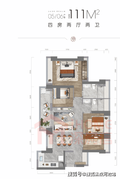 111㎡的4房2厅2卫,设计的是横厅南北通透格局,进门入户玄关,客餐厅5.6米开间,LDKB一体化设计,五开间朝南,客厅连接次卧出6.15米长的大阳台,U型厨房,卫生间干湿分离,得房率约75.4%(不含赠送),阳台主朝东南或西南向,其中西南朝向可以看阳台山景。