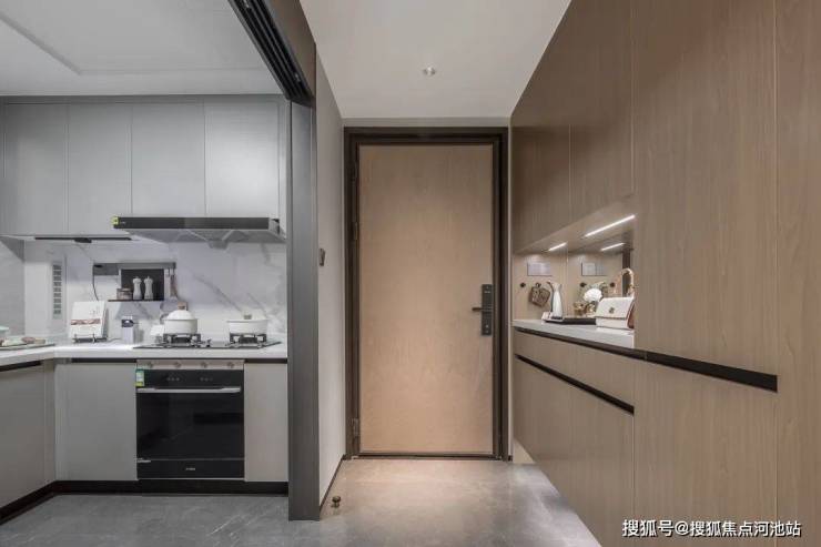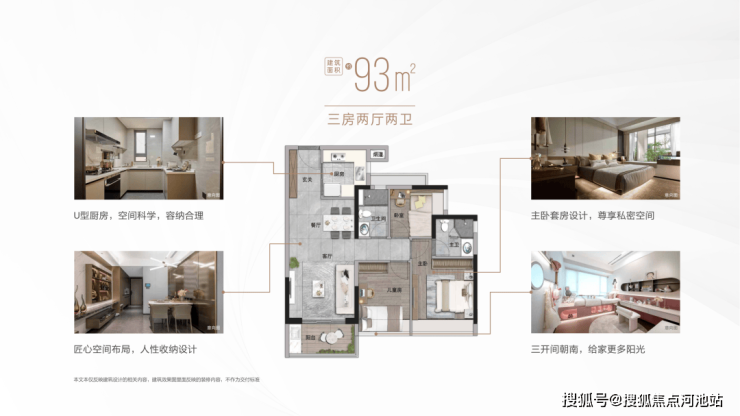 :77㎡三房得房率88.44%,U型厨房、三开间朝南;114㎡四房双阳台设计,四开间朝南。