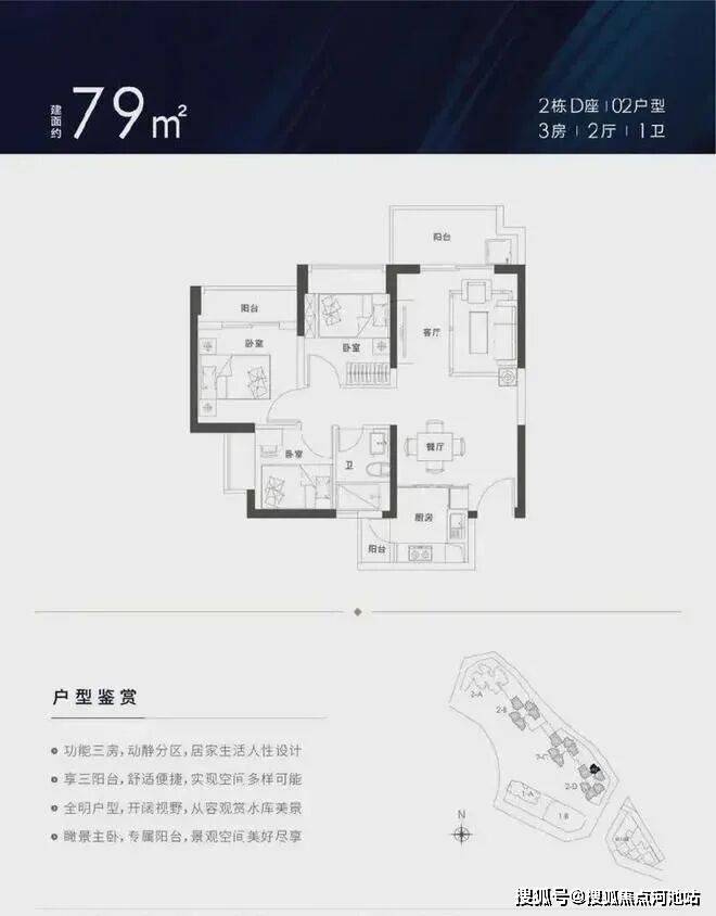 79-81㎡的3房2厅1卫,设计的竖厅格局,厨房带小阳台,客厅东北朝向,高层可看水库景观。