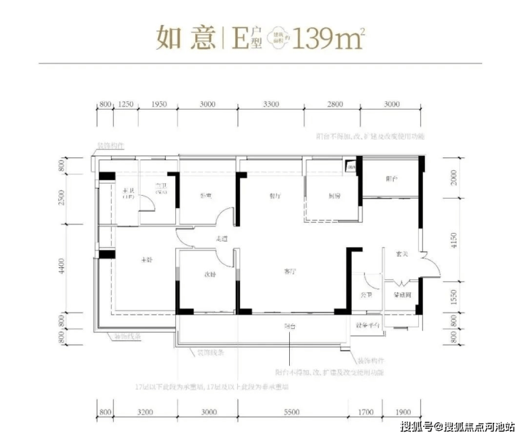 139㎡的4+1房2厅2卫,设计的是竖厅南北通透格局,进门赠送约5.2㎡的入户玄关(不计算在户型图内),客厅5.5米开间,LDKB一体化方厅设计,5个卧室分别做到了主卧27.56㎡/次卧10.2m²/次卧9.9㎡/次卧9.9㎡/次卧4.46m²(包含墙体飘窗),L型厨房,得房率约81%(不含赠送),客厅连接次卧出13.6m²的观景大阳台,主朝西南向。套内面积112.59m²+赠送面积31.98m²=实际使用面积144.57m²,加上赠送后得房率约104.01%。