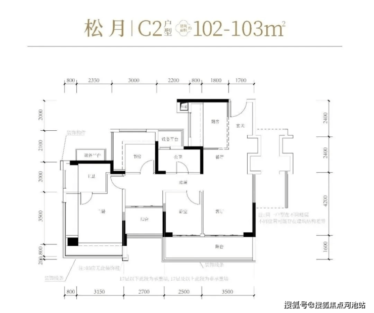 102-103㎡的4房2厅2卫,C1-C2户型,设计的是经典竖厅格局,进门入户玄关,客厅3.5米开间,LDKB一体化,S墙设计预留冰箱卡槽位,动静分区,四开间朝南,4个卧室分别做到了主卧17.98㎡/次卧8.37㎡/次卧8.1m²/次卧7.75㎡(包含墙体飘窗),L型厨房,公卫干湿分离带1个约2m²的设备平台,得房率约81%(不含赠送),客厅连接次卧出9.6m²的观景大阳台,东南或西南朝向。套内面积83.43m²+赠送面积23.86m²=实际使用面积107.29m²,加上赠送后得房率约104.16%。