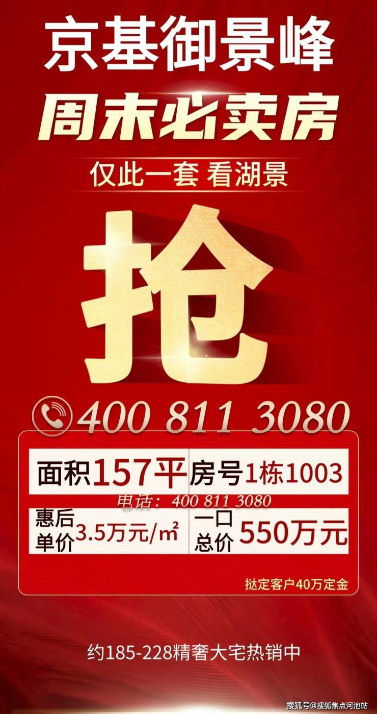 好消息:今天我们楼盘推出一套一口价可以看房湖景的特价房:面积157平米,总价550万起!